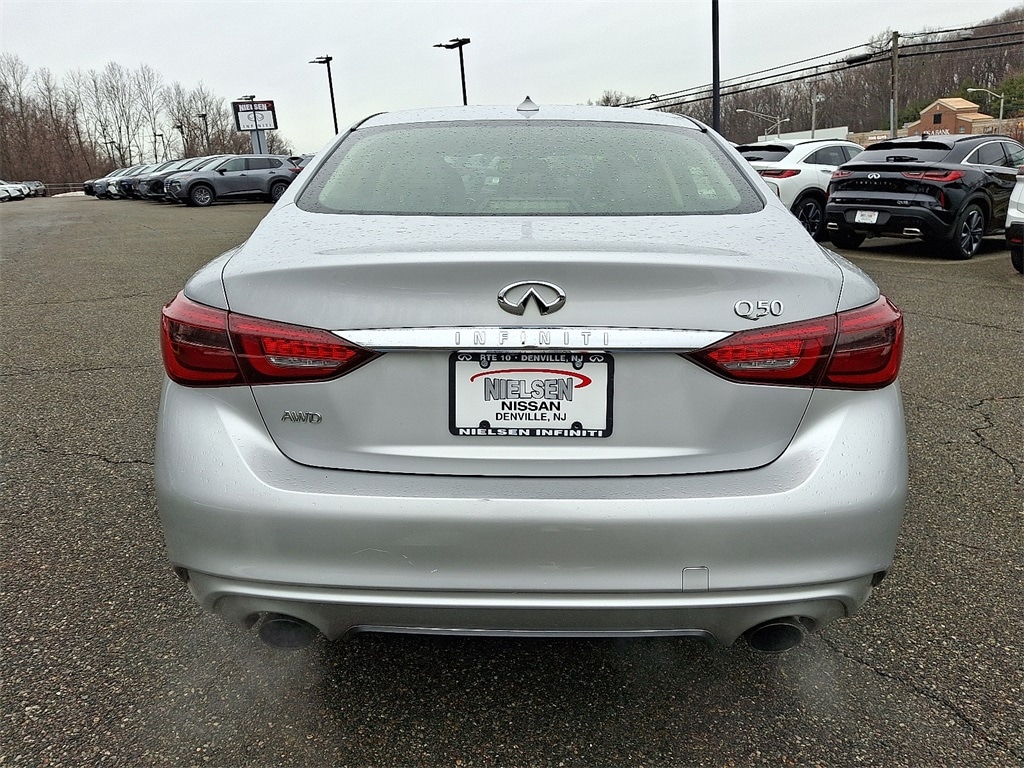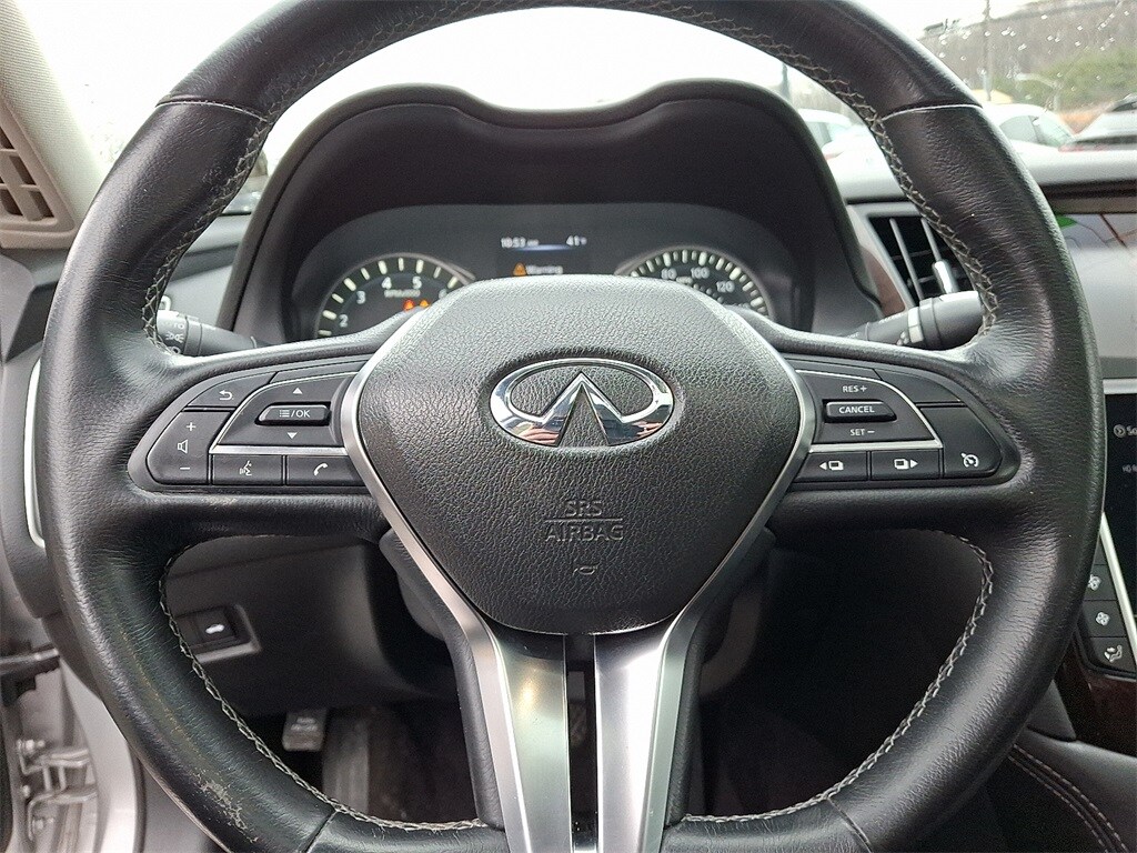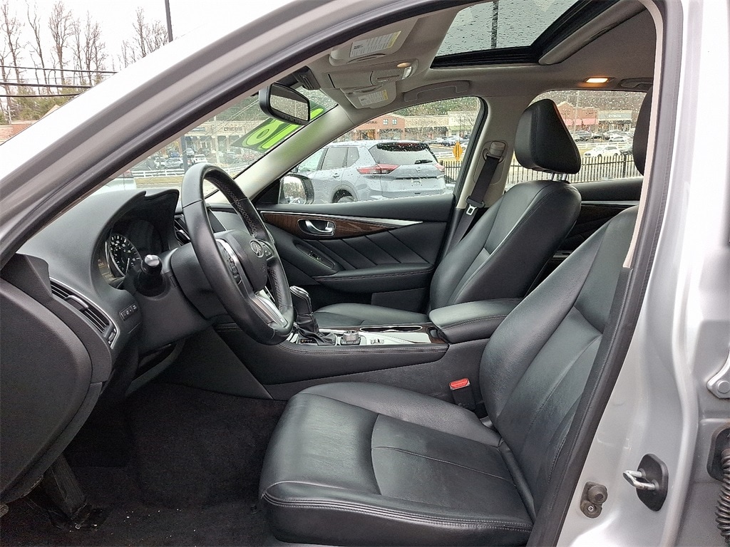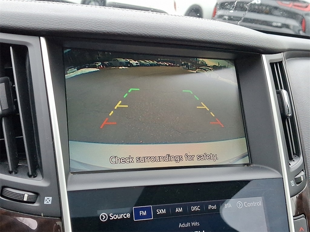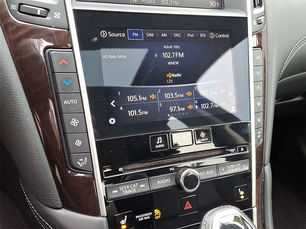 Inside, the Q50 exudes elegance and refinement. Genuine wood accents on the console, dashboard, and doors combine with leatherette seating surfaces, leather shift knob, and leather-wrapped steering wheel for a rich, upscale cabin environment. Heated door mirrors, dual-zone automatic climate control, and a power moonroof elevate comfort and convenience, while the spacious interior accommodates passengers with a premium feel throughout.